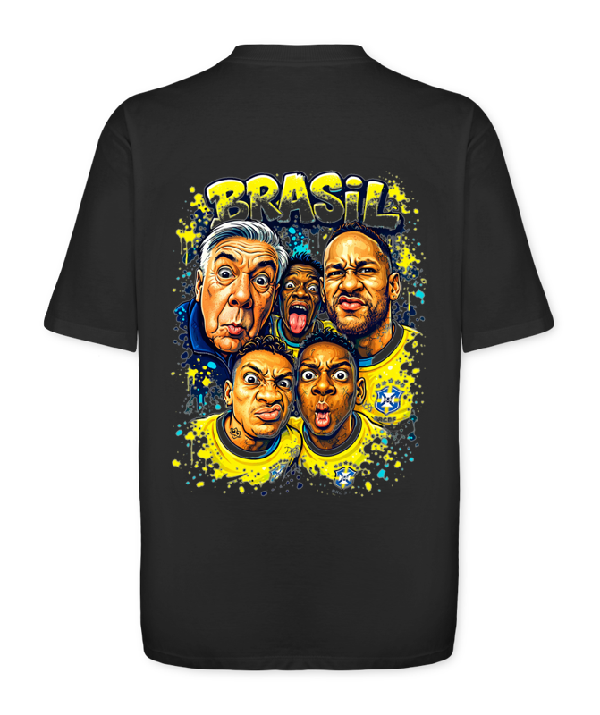 Uma peça que une o humor, a irreverência e o futuro da Seleção Brasileira em um estilo puramente urbano. A estampa frontal traz a assinatura "AETHER" em grafite bubble vibrante, preparando o terreno para a arte principal nas costas: uma releitura artÃstica da icônica "selfie" da nova geração. Com o técnico Carlo Ancelotti e craques como Neymar e Vini Jr retratados em traços de grafite, contornos fortes e muitos respingos de tinta, esta camiseta captura a energia e a expectativa dessa nova fase do nosso futebol. É o encontro do estilo das ruas com a elite do esporte mundial.